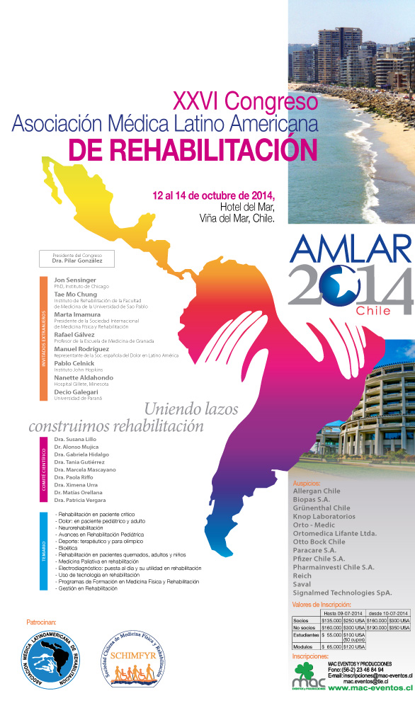 09.07.2014 23:34Ya se encuentran abiertas las inscripciones para el XXVI Congreso Asociación Médica Latino Americana de Rehabilitación a realizarse del 12 al 14 de Octubre, Hotel del Mar, Viña del Mar, Chile.